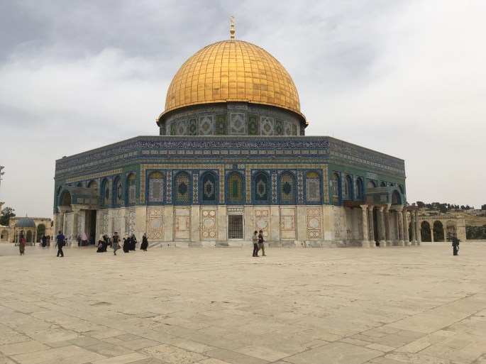 Toward the end of the tour I realised that I was going to miss out on seeing the Dome of the Rock unless I left early and hurried through the labrythine streets to get in the line. Darryl stayed on the tour and I ran! I arrived in time with only my wallet and camera – alack, I had forgotten my headscarf! I joined the queue hoping for the best. After going through security- you must have photo ID – I headed up the ramp, purchased a scarf to cover my arms, and started to explore. As a non-Muslim, I couldn’t enter the mosque itself. The mosque sits on one of the most important sites in all three religions – Islam, Christianity, and Judaism. According to Jewish tradition, it is the centre of the world from which God gathered the soil to fashion Adam, the first man. Here where Abraham bound his son Isaac. Various temples were located here, including that sacked by Roman Vespasian and Titus during the sack of Jerusalem, but most importantly for Muslims, this is where Abraham ascended to heaven. Currently, Jews cannot access Temple Mount so instead pray at the Western Wall, the Wailing Wall, as it is as close as they can get to the Foundation Stone and holiest site for their faith.
